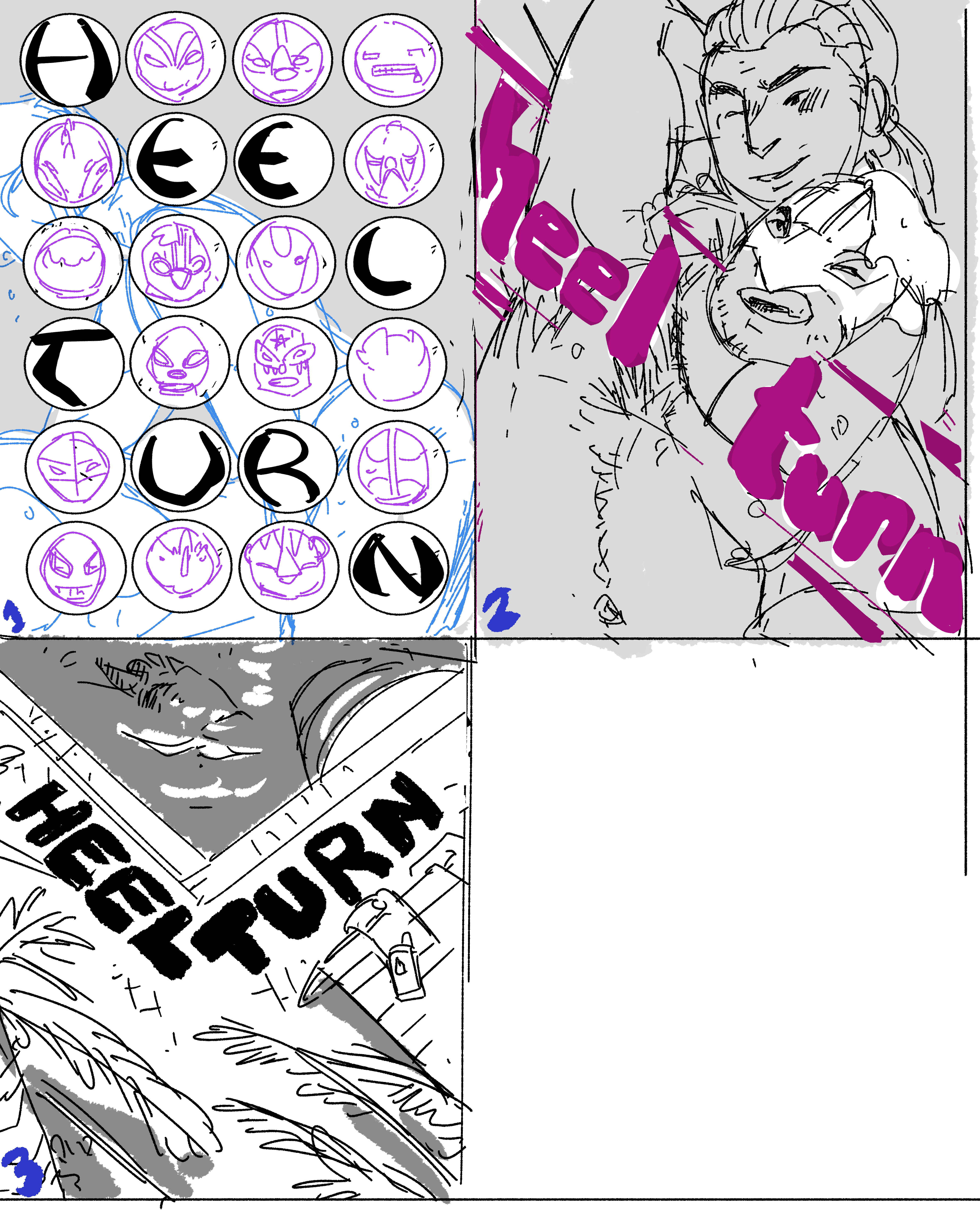 Heel Turn covers Posted on 2021-11-22 by Nero Some cover thumbnails for my next Filthy Figments comic- Heel Turn, a very y2k themed luchador comic set in Miami. I’m a bit behind on it, but excited to get to actually working on it soon.
