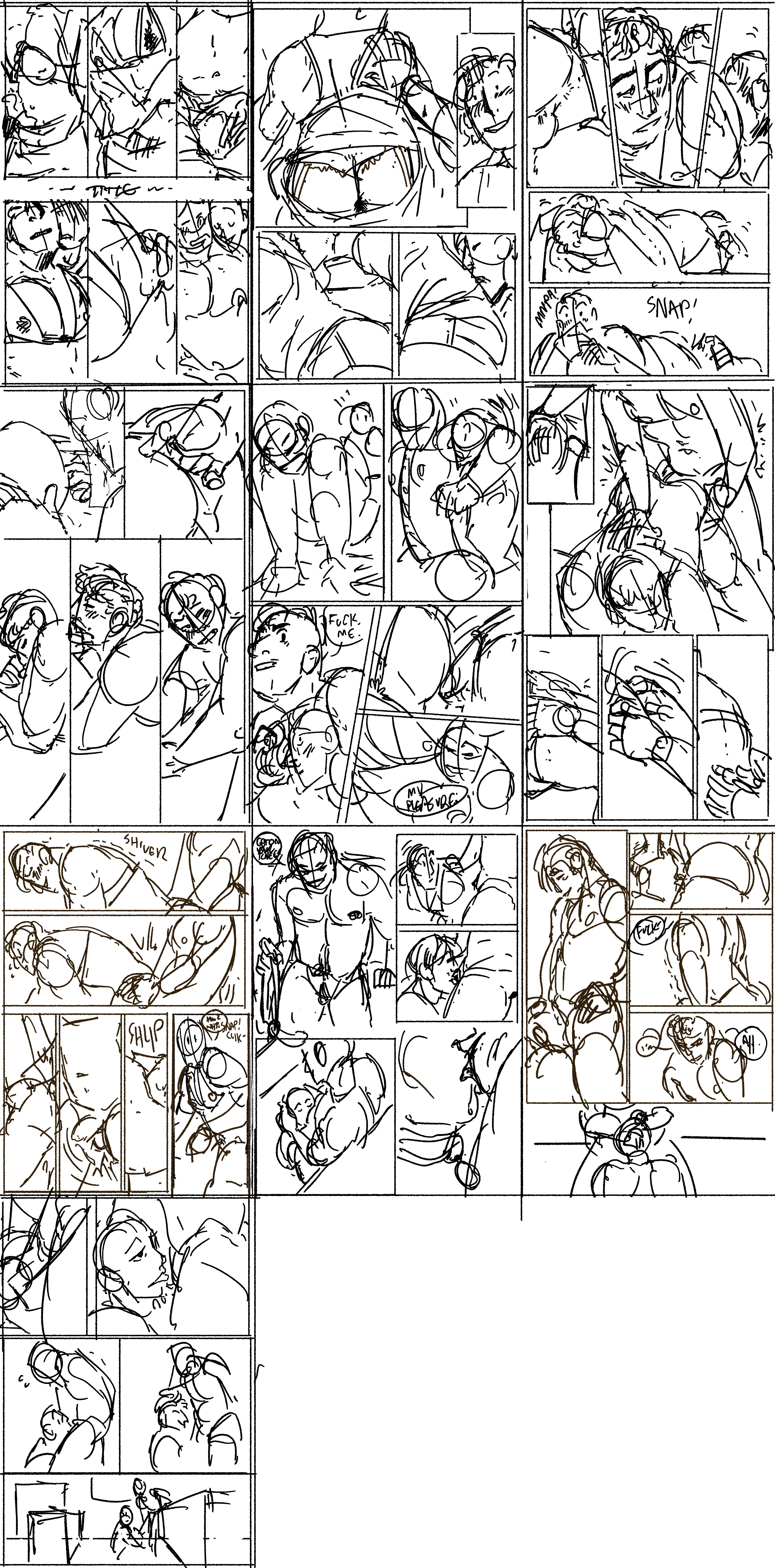 06.15.19 Posted on 2019-06-152019-06-13 by Nero Very rough thumbnails for the next porn short. I’m still waffling on character designs, so the figures are super generic for now. Might make the one in lingerie a furry or a similar fuzzy, kinda mean looking guy? It’s a good contrast.