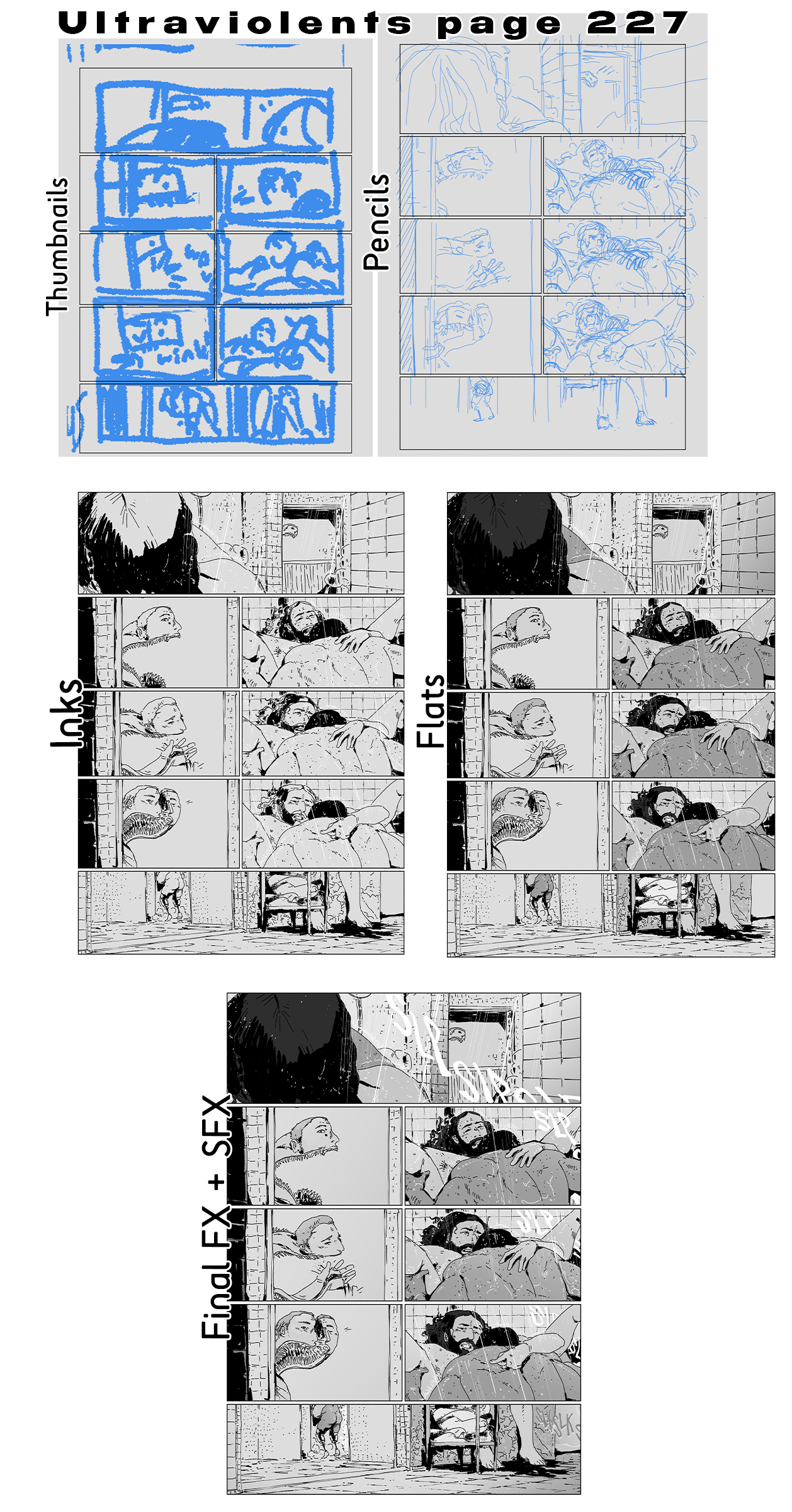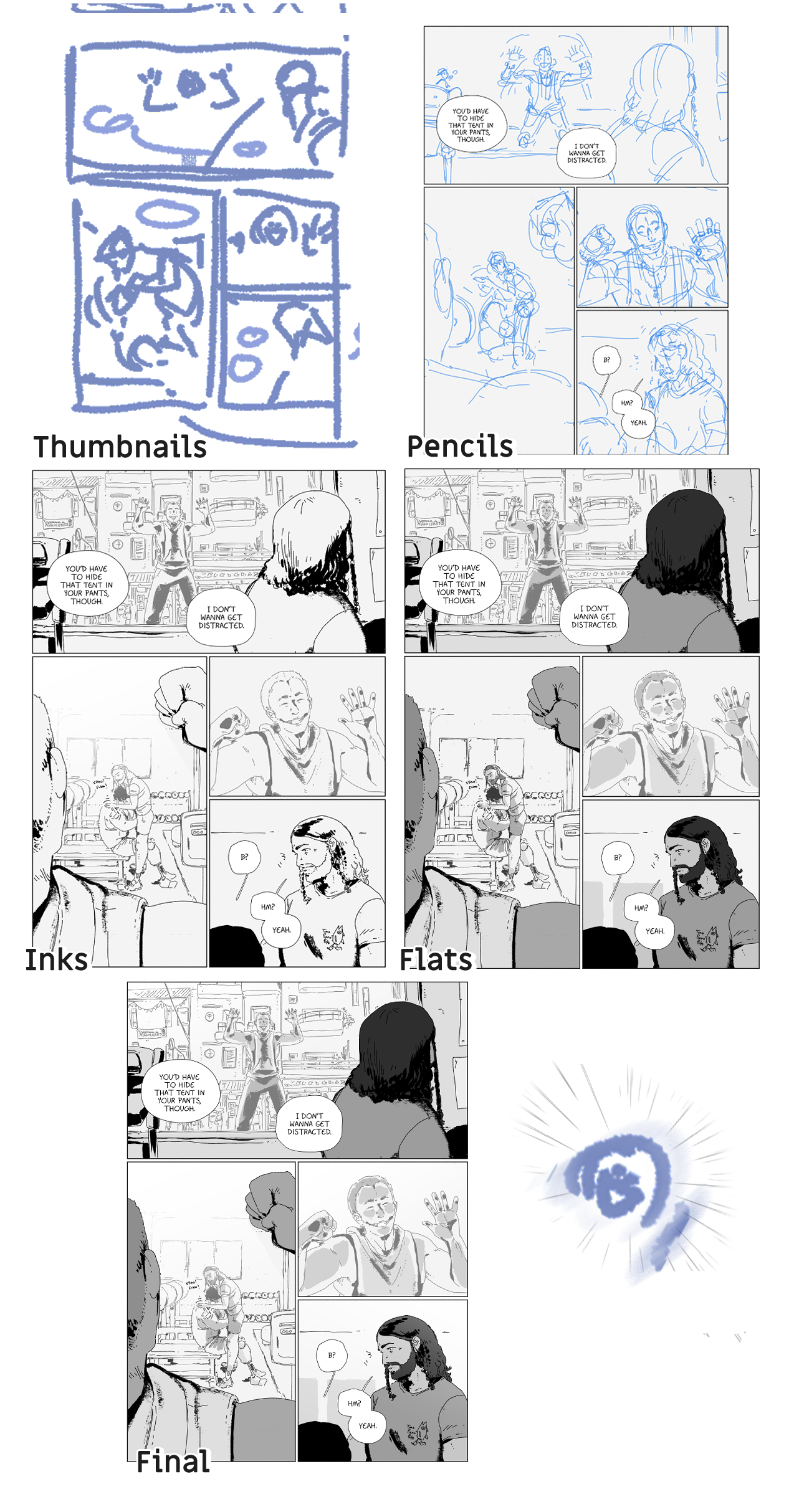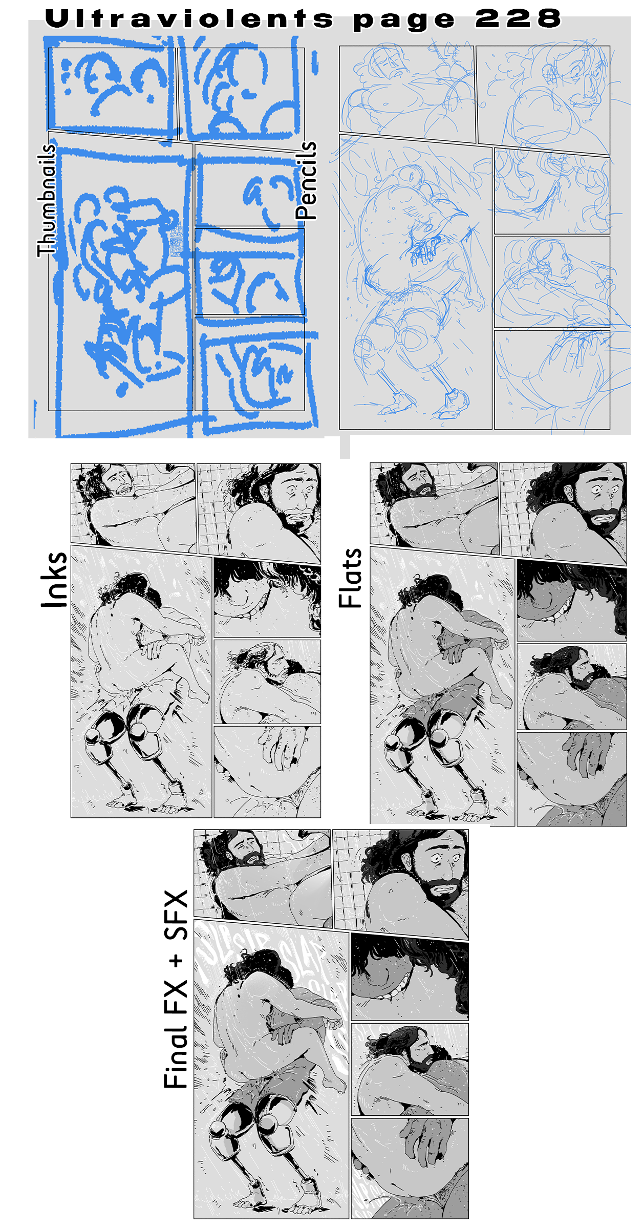 After the recent Making of a Webcomic panel I was on for the Nib & Ink Festival, I’ve had some folks ask me more about process! These are pretty quick for me to set up and it seemed like an interesting insight into the comics making process that’s easier to digest than some of the timelapse videos I’ve done, ahaaa. Here’s one for the most recent UV page!