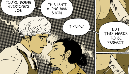 Wedlocked (illustrated by myself, co-written alongside Iris Jay): When caterer Daz unwittingly falls into photographer Willoughby and tailor Iago’s lives, will they be polyamorous… or poly-antagonists? Three middle aged transmen face down each other and themselves behind the scenes of the happiest day of your life in WEDLOCKED! Runs Weds/Fri starting in August, also running on Slipshine.